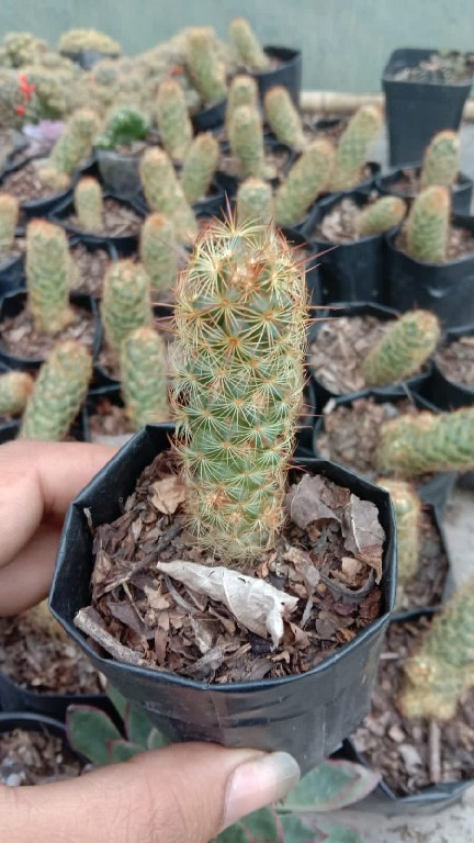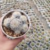 Tall, cylindrical cactus with a dense covering of short, coppery spines. This cultivar can grow to about 6.0″ tall and freely offsets to form dense clusters. It produces sweet, mini flowers of white, pale yellow, or pink.