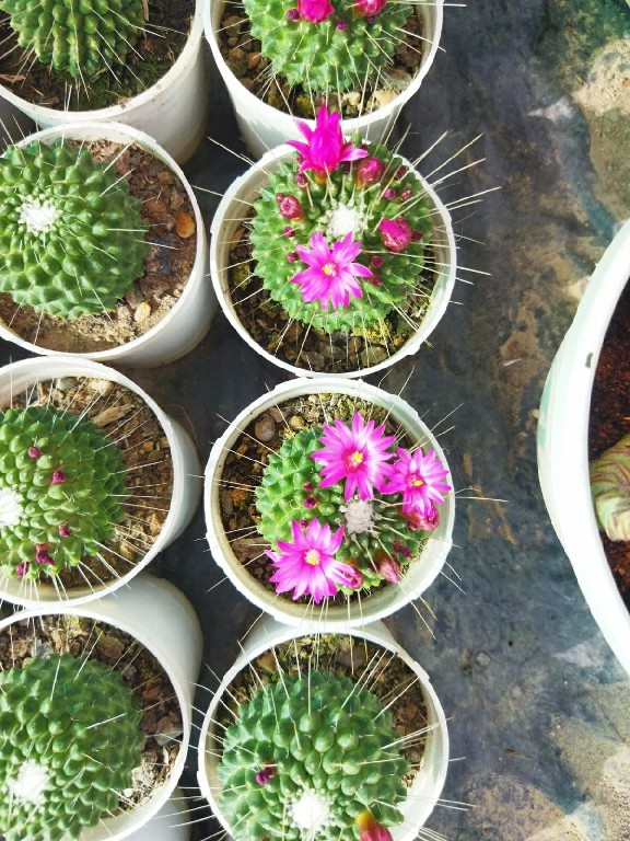 A small cactus, with solitary or clustered stems, that tends to form large clumps over time. At first globular, later cylindrical, the stems, up to 12 in. tall (30 cm) and 4 in. wide (10 cm), are covered with dense white bristles and fine spines.