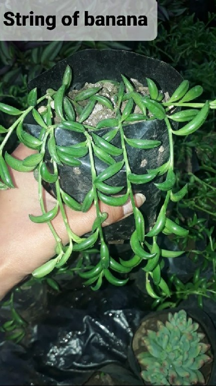 What Is String of Bananas Plant? Contrary to its name, string of bananas (Curio radicans) is not a fruit, but a succulent vine plant with banana-shaped leaves. This South-African native plant is part of the Asteraceae family, and it features small, white flowers that bloom in early spring.