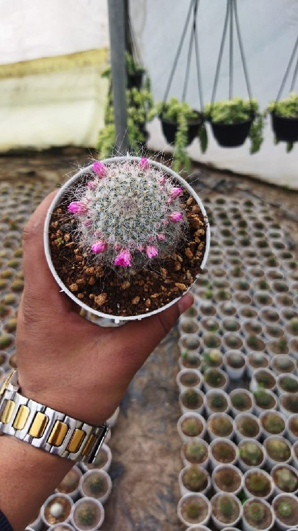 Mammillaria hahniana, the old lady cactus, is a species of flowering plant in the family Cactaceae, native to central Mexico. It grows to 25 cm (10 in) tall by 50 cm (20 in) broad. The solitary spherical stems, 12 cm in diameter, are covered in white down and white spines.